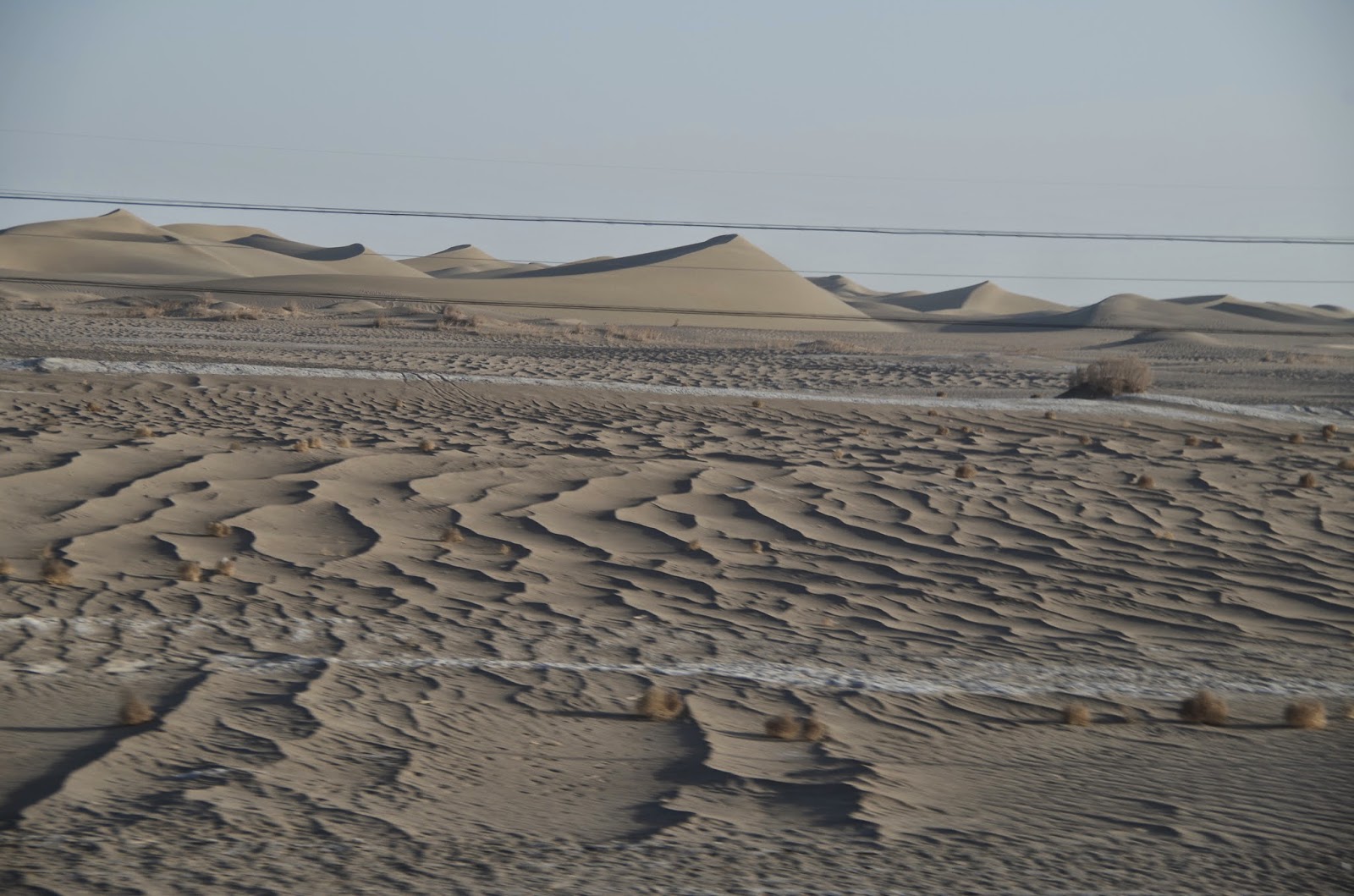 La descente du plateau himalayen nous rapproche du désert du Takla-Makan. L’air est sec et nous irrite la gorge. Bientôt, le vent se lève et transport avec lui une poussière de sable. Au loin, des troupeaux de dromadaires avancent seuls, semblant connaitre leur chemin. Dans les dunes, des traces de mobylettes nous renseignent que la ville n’est plus très loin. Des infrastructures modernes tapissent ce décor perdu. Autoroutes, nouvelles voies ferrées et antennes de téléphonie quadrillent les zones où seuls quelques bergers éparses transhument encore. Endiguement des cours d’eau, barrages hydrographiques et entrepôts logistiques bourgeonnent dans les champs de Yacks. Élargissement des rues anciennes. On rase les maisons pour faire passer les infrastructures. On trace droit, au plus direct. Ponts. Béton. Tunnels. Un niveau d’urbanisme si conséquent à l’un des bouts du bout de la Chine, aux antipodes du quart économique le plus peuplé…